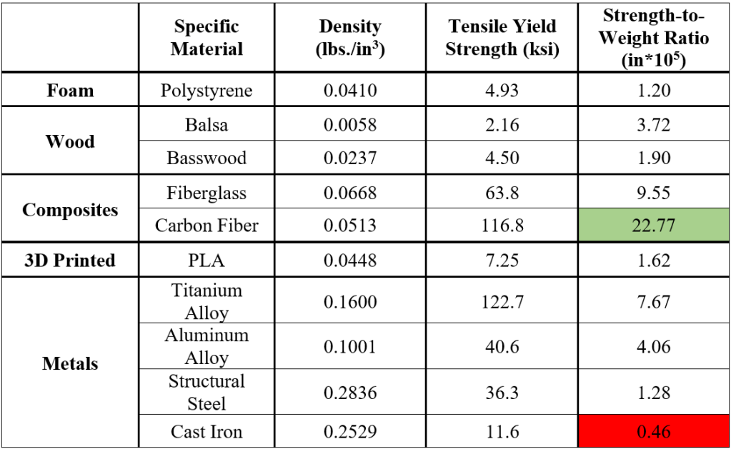 Using the above logic, it would make sense to make a plane entirely out of just foam or balsa, right? While we could do this, it would likely be far too fragile to be capable of many of the past mission requirements and would also take a very long time to fabricate with the tools currently available to DBF. This is where strength and durability must factor into our material selection: we need our plane to be strong enough to withstand the lift and drag forces of flight and complete mission requirements, but also light enough to actually fly. Because of this, materials with high strength-to-weight ratios often work best for high-stress areas of the aircraft or any areas that you need to be load-bearing. The following table shows the strength-to-weight ratios for materials commonly used by DBF and also some common metals for comparison.