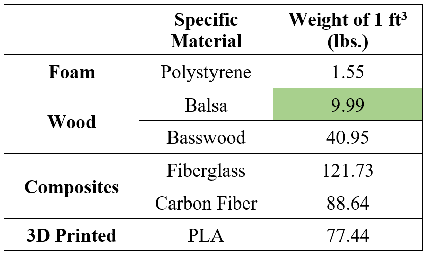 Weight is often the most difficult and easiest to neglect side of RC aircraft fabrication. Simply put: the lighter an aircraft is for any given planform area, the better flight characteristics it is capable of. To learn more about this relationship with stability, see Aircraft Design Tutorial. Because of this, you always want to make your aircraft as light as it possibly can be with smart material selection. Unfortunately, optimizing an aircraft to be as light as possible comes with many tradeoffs related to cost, time to manufacture, and, most frequently, strength. For many materials of a given density, lighter also means weaker. This is why it is important to understand the statics and kinematics of the aircraft you are designing, so as to avoid over-engineering and making the aircraft heavier than it actually needs to be while still being confident your plane won’t fall apart mid-flight. For comparison between materials, the following table shows what each of these common materials would weigh for a given volume.
