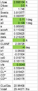 Now that we’ve got the physical parameters hammered out (almost), we get to move on to the more theoretical aspect of the design. The Aero Analysis tab goes into some heavy-duty math, which is covered in ME305, ME461, and ME405. While taking ME461 is enough to know what to make of this page, ME405 goes into a lot of the assumptions that the spreadsheet makes and can also help inform you of what a lot of these parameters really mean. For the purposes of this tutorial, I will only be discussing what the values highlighted in green are, as those are the parameters you get to choose and need to understand. The first value you’ll pick is LFuse which stands for fuselage length. The previous tab gives you an acceptable range of lengths to pick from, and you should choose a length which makes sense for the competition that you’re flying. The next option is DFuse, which is the fuselage diameter. This spreadsheet assumes you’re building a completely cylindrical plane that is wasped, if your plane is not going to be a cylindrical plane (very likely), do your best guess of an approximate diameter. The next values are at and a0 which refer to the two-dimensional lift curve slope of your airfoil for the tail and wing, respectively. These can be read directly from NACA data for the airfoil of your choosing. If this is above your head, pick 0.10 as a conservative guess. ZH refers to the height above the chord line of your wing that the chord line of your tail is at. If your wing and tail are in-line, this value will be zero. Next is aL=0 which is the angle of attack at which your airfoil experiences no lift, which can be determined by the specific airfoil you pick. If this is something you cannot determine for your airfoil, a heavily conservative estimate is 0, but -2 is often standard. Finally, CFE is the skin friction coefficient of your entire aircraft. 0.0045 is a decent estimate, this is probably not the largest concern you’ll have in designing your aircraft. When all of this has been determined, the spreadsheet will spit out a plethora of important information. Some of the key values are the maximum lift to drag ratio coefficients, denoted by CL* and CD*, as well as your parasitic drag, CD,0 and your maximum lift coefficient CLMNF. It is also able to give you some important information in this tab like stall speed and your drag polar, which graphically relates your lift and drag coefficients. Pictured in Figure 4 are nearly all the previously discussed parameters as they appear in the spreadsheet.