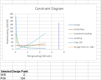 The constraint analysis will take your geometric parameters and your aerodynamic parameters and use those to give you a visual aid for the physical performance of your aircraft. The Master Constrain Equation (MCE) is a particularly useful tool for visualizing aircraft performance. This equation relates the physical acts being performed by the aircraft to the wingloading and powerloading of your aircraft. The wingloading of your plane is the weight in pounds of your plane at takeoff divided by the planform area of your plane in sqft. The powerloading varies based upon whether you are working with a propellor based plane or one which has an engine, but for DBF purposes the powerloading will relate the thrust being produced by your plane in pounds to the weight of the plane in pounds. By modifying the MCE for certain scenarios like cruising, climbing, or sustaining a load (turning) and then plotting each of these constraints as a function of wingloading to solve for powerloading, you can create a constraint diagram that shows you for a certain wingloading value what the minimum powerloading value you need to spec your plane to. This influences your motor/propellor/battery choices very heavily. The wingloading you pick determines what fabrication techniques you can use and often comes at a tradeoff of structure. Additionally, situations like taking off and landing in certain distances are plotted on this graph, but notably do not use the MCE. The criteria you specify, such as cruise speed, climb rate, sustained loading factors, take off/landing distances are all available for you to change in the ‘Desired Criteria’ tab. This tab is built to contain the bare minimum information needed for designing a plane but can also evolve to contain information regarding topics like the antenna which the 2022-23 team had to account for. As a general rule of thumb, the higher you can spec your powerloading and the lower you can make your wingloading without violating any of the constraints is the best choice. Once you’ve settled on a wingloading/powerloading combination make sure to update that below the graph, as it will affect information like stall speed, and your mission specific pages. An example of a constrain diagram can be seen in Figure 5.