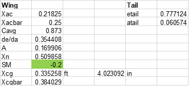 Now comes the fun part of aircraft design, the sizing aspect. Taking everything, you’ve said you want your plane to be able to do, and everything that you’ve calculated your plane can do, we need to guarantee that this plane can be built using modern manufacturing/fabrication methods. This is like a double check to ensure that if you’re building this plane out of carbon fiber and fiberglass, you’re not also expecting it to weigh as much as a feather. Therefore, the sizing tab uses approximations of actual fabrication processes and back calculates what an expected planform area for the things you want your plane to do would be. It then compares this to the planform area you initially provided all the way back on the geometry tab, and so long as you’re within a 1% match, you’re good to go. If you’re using the ME461 spreadsheet, the values put into this page have been collected from decades of industry standards and averages and are very good for the purposes of the class. In the case of DBF, some of these values don’t compare between an F-15 and a balsa wood plane. For that reason, the 2022-23 capstone team has updated the sizing tab to consider materials typically used by the team, such as balsa wood, fiberglass, and monokote. In Figure 6, the values in green are what you’re free to make changes to, such as the weight of the battery you’re using, or the weight of the landing gear you want on your plane. By determining these values ahead of time, it helps zero in on the plane design that will work best for you. Note that Wwing/S is determined to be 0.4 for wings made from balsa wood, an internal spar structure, and foamboard. If utilizing heavier materials, it will be important to recalculate this number to accurately represent the plane you plan to build. This goes for many of these values in green, estimate to your best ability the weight of these subsystems and then input them into the spreadsheet normalized by your theoretical planform area. Once this step is done, if your % difference is not < 1.0%, it is time to start iterating. Make small changes to your value of wingloading, as well as other things like the planform area and aspect ratio. Sometimes adjusting tail values on the geometry tab has a larger influence than you would expect. Maybe try and pick a different airfoil, and update those values under the aero anlys tab. There is no single correct answer here, it is a matter of continuously changing your optional values until you settle on an option close to what you’re looking for.