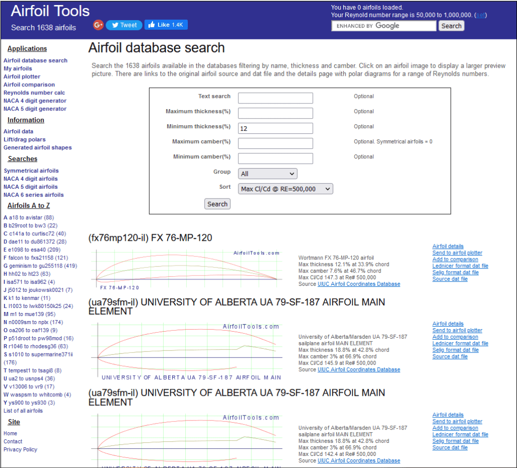With the constraints from the previous section, the Reynolds number, and the knowledge that we wanted a semi-symmetric airfoil, we can find the optimal airfoil. Using airfoiltools.com, we can search for the best Cl/Cd under our filters, Reynolds = 580,0000 and max thickness = 12%.