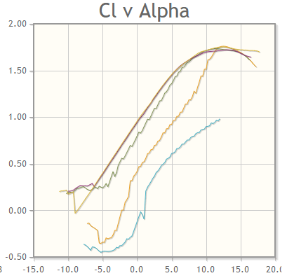 Airfoil performance is very complicated to mathematically determine from geometry alone, so most airfoils are tested in wind tunnels under a variety of conditions to measure their performance across a range of speed and pressures. If this were a more extensive project, the airfoils would be designed from scratch, optimized entirely to the missions. This test data is readily available at airfoiltools.com, (and other places, but they are much harder to search through), and is normalized by Reynolds number, Cm, and Cl/Cd values. The Reynolds number represents the qualities of the airflow, Cm is the moment the airfoil produces, and Cl and Cd represent the lift and drag, respectively. The relationships between these values and alpha, or the angle of attack, are plotted in the airfoiltools.com database such that inspecting a particular airfoil will reveal key dynamics. These dynamics can then be used in the design process to optimize the vehicle.
