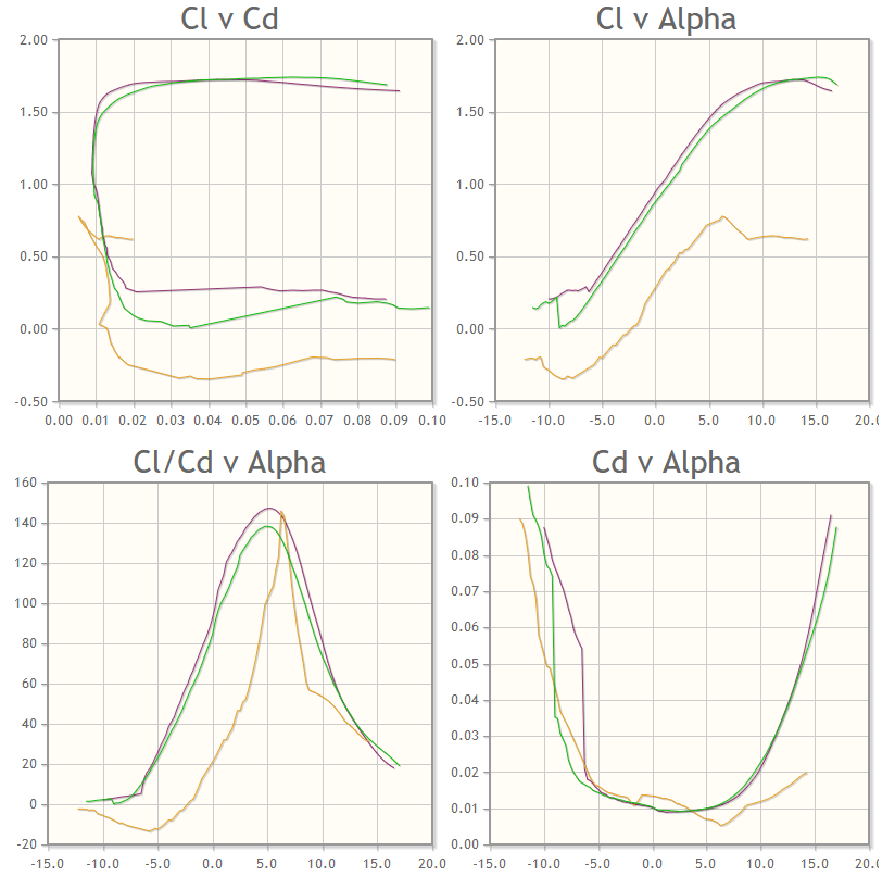 Comparing the next couple of airfoils using the comparison tool, we can see that the one we chose provides the best ratios of lift to drag and lift to alpha, only performing worse when the angle of attack is negative (note that for this vehicle we do not care about acrobatic maneuvering. Note that the purple line is our currently selected airfoil at Reynolds = 500,000.