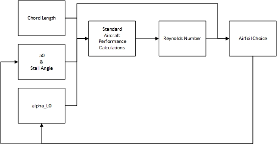 The process begins with the conventional simplification of an airfoil into a Cl/alpha ratio, which is what is taught in the Intro to Aero and Aircraft Design classes. This gives us a value, a0, that represents the airfoil performance. This begins with a standard value, a0 = 10/deg. This initial guess is accompanied by a stall angle of alpha = 10 deg. that was likewise determined from average airfoil performance and provides a usable baseline.