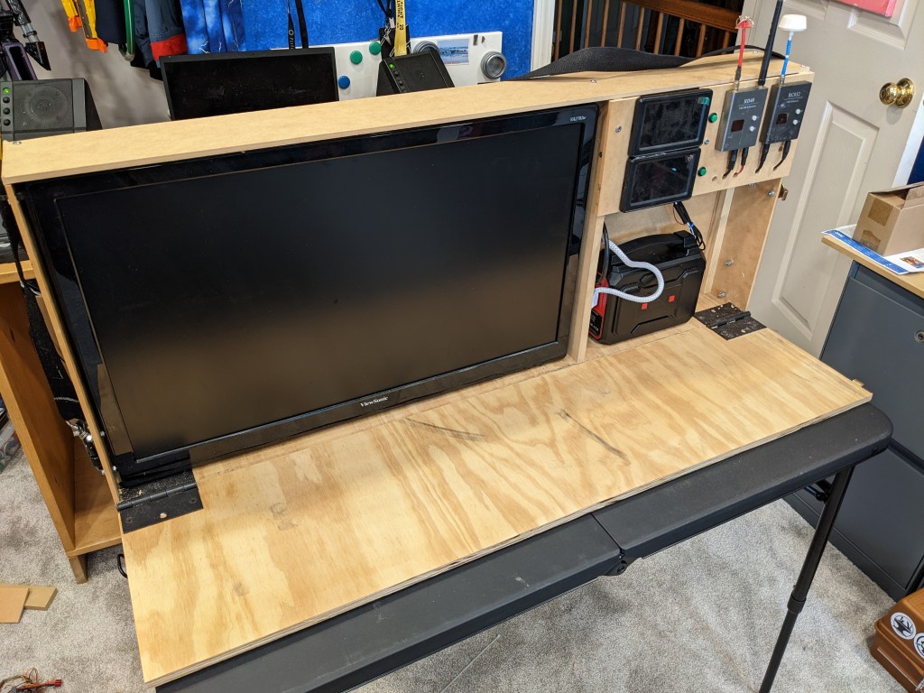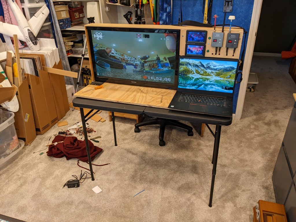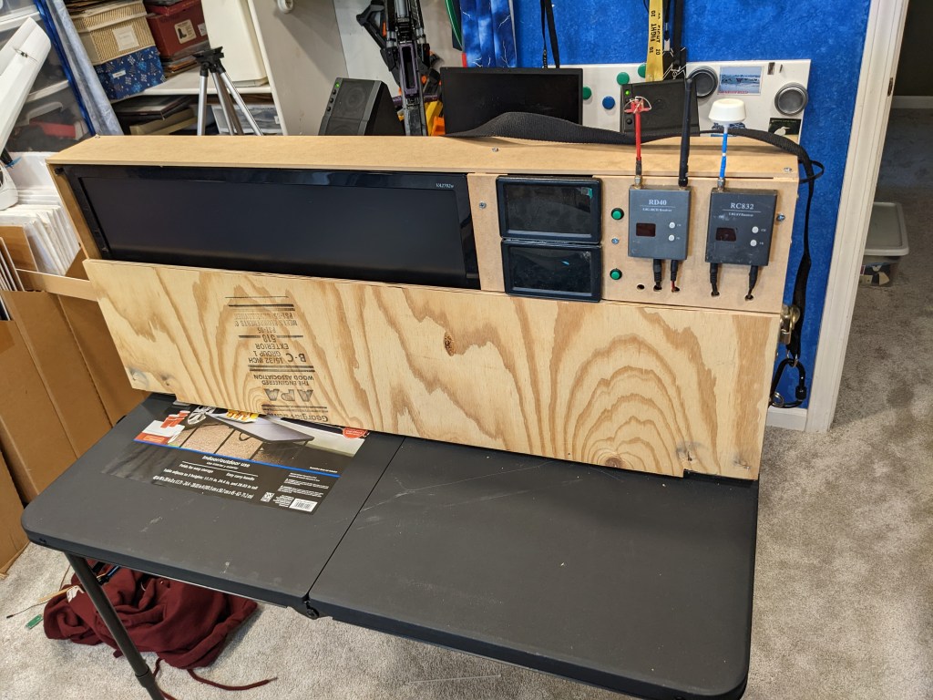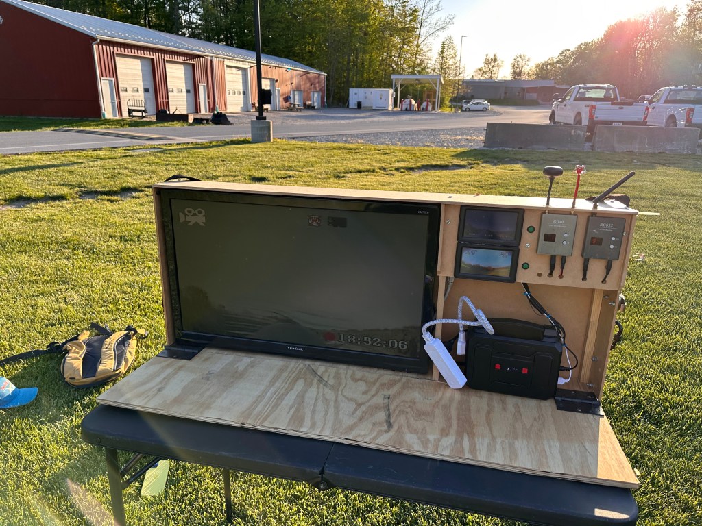 This is the first iteration of an FPV monitoring display that is entirely hands-free and can be seen by multiple people. This version was a weekend project, using scrap parts with the exception of a 186 Wh portable battery. Currently, the design uses a DVR recorder to avoid a blue screen on the monitor when the signal gets bad. This design neatly folds up and has a carrying strap to help with transporting it. There are two FPV receivers, both displaying on the smaller monitors and with the diversity receiver also showing up on the larger monitor. My laptop also fits perfectly in the space below the receivers.